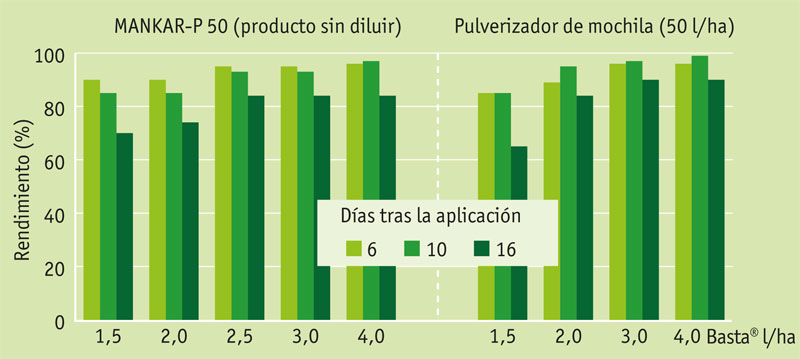 En cultivos sensibles en los que sólo se pueden aplicar unos pocos herbicidas, también se puede aplicar la técnica ULV. Un ejemplo es el uso de Basta® (glufosinato– amonio 200g/l) en pepinos de cultivo exterior. En una prueba de Bayer CropScience en 2008, se aplicó el herbicida en dosis escalonadas de 1,5 a 4 l/ha sin diluir con un MANKAR-P 50, en comparación con el usual pulverizador de mochila (AirMix 01, con la relativamente escasa cantidad de agua de 50 l/ha). Conclusión: Los pepinos no sufrieron ningún daño. El efecto de los sistemas pulverizadores ULV MANKAR® y de los pulverizadores de mochila es equiparable, siendo necesario esparcir un mínimo de 2 l/ha de Basta.