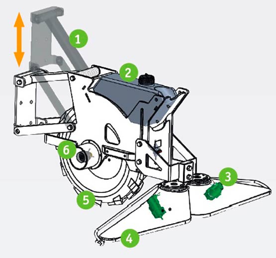 Een beweegbaar parallellogram dat de verbinding tussen de Flexomant module en een passend aanbouwsysteem en ook het continue contact van het wiel met de grond en de gelijkmatige afstand tussen de grond en de spuitschermen veiligstelt.